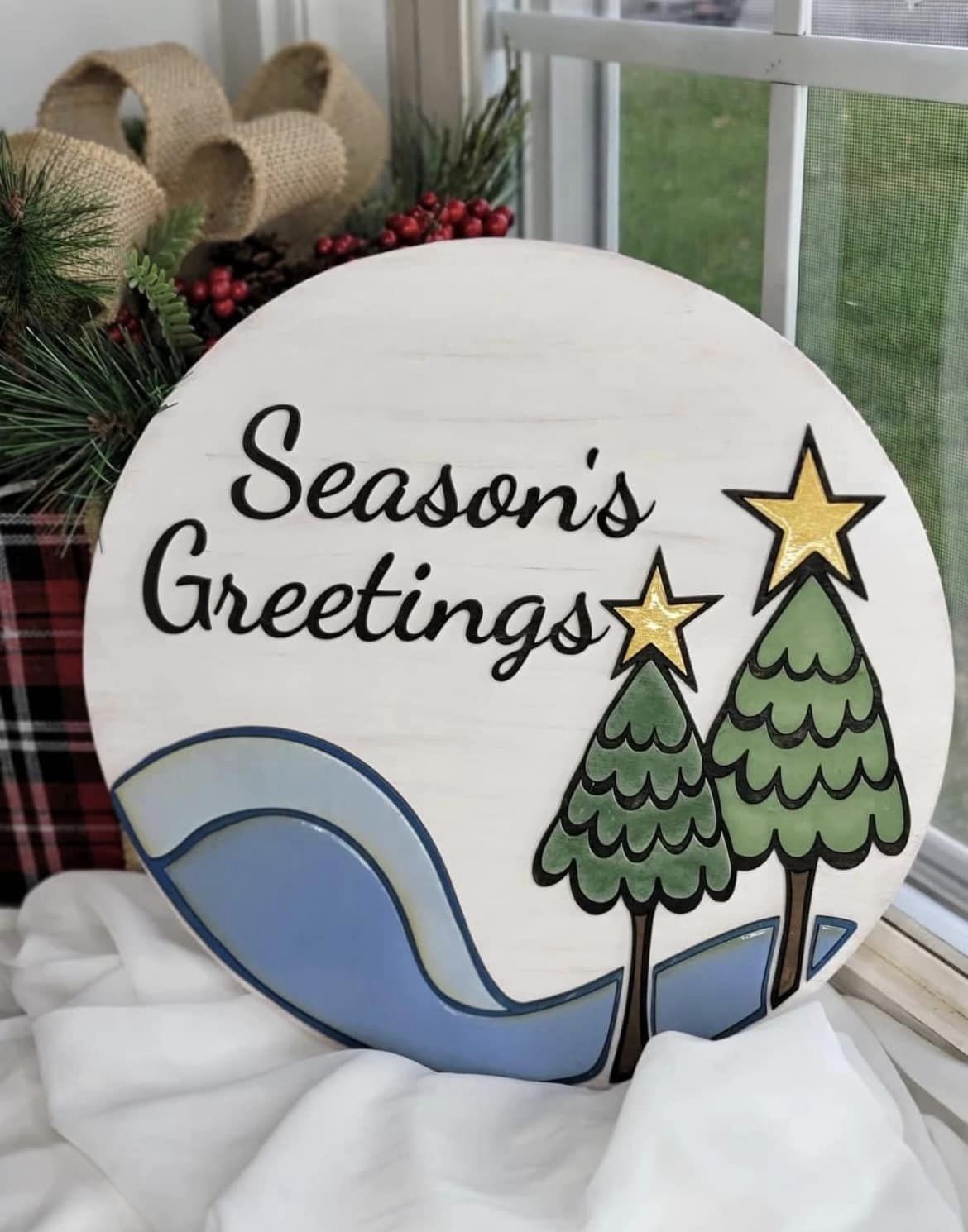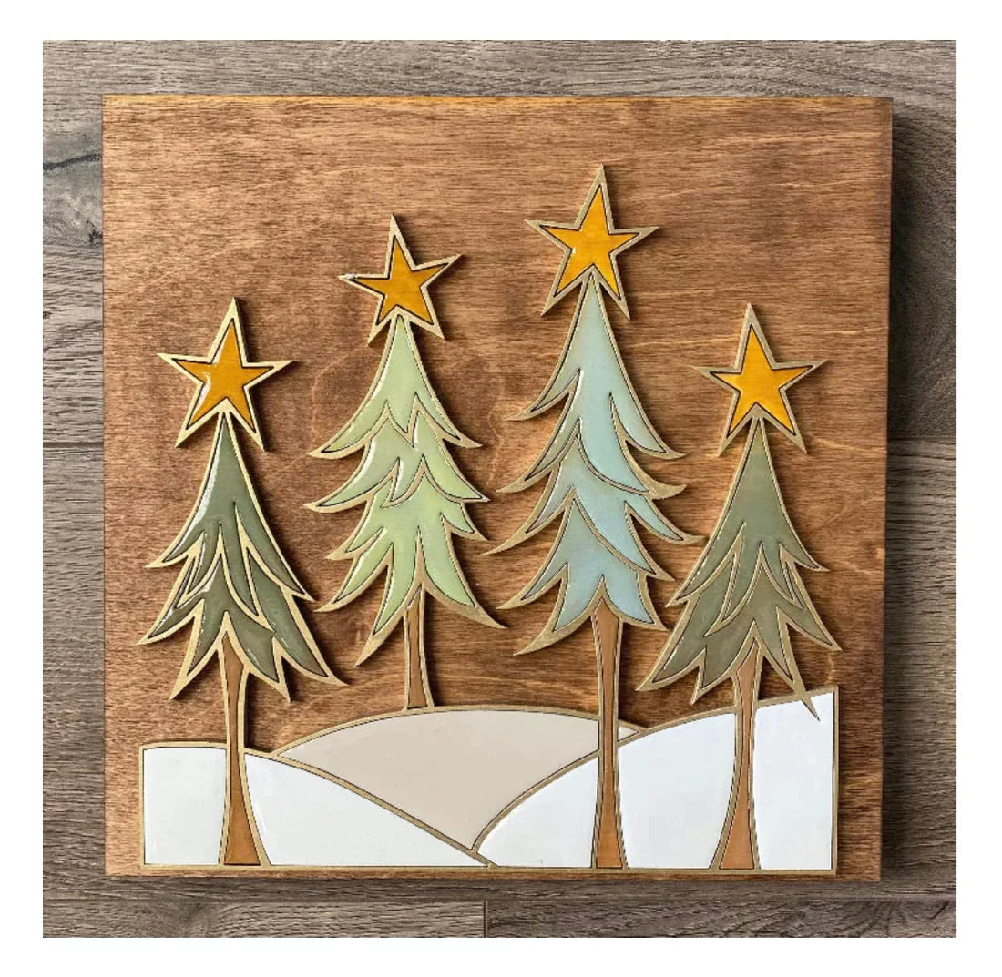 Each piece features laser-cut wood elements that you’ll paint and then affix to a wooden round. We’ll finish it off with a liquid glass coating for a gorgeous, shiny, raised finish that looks like glass!