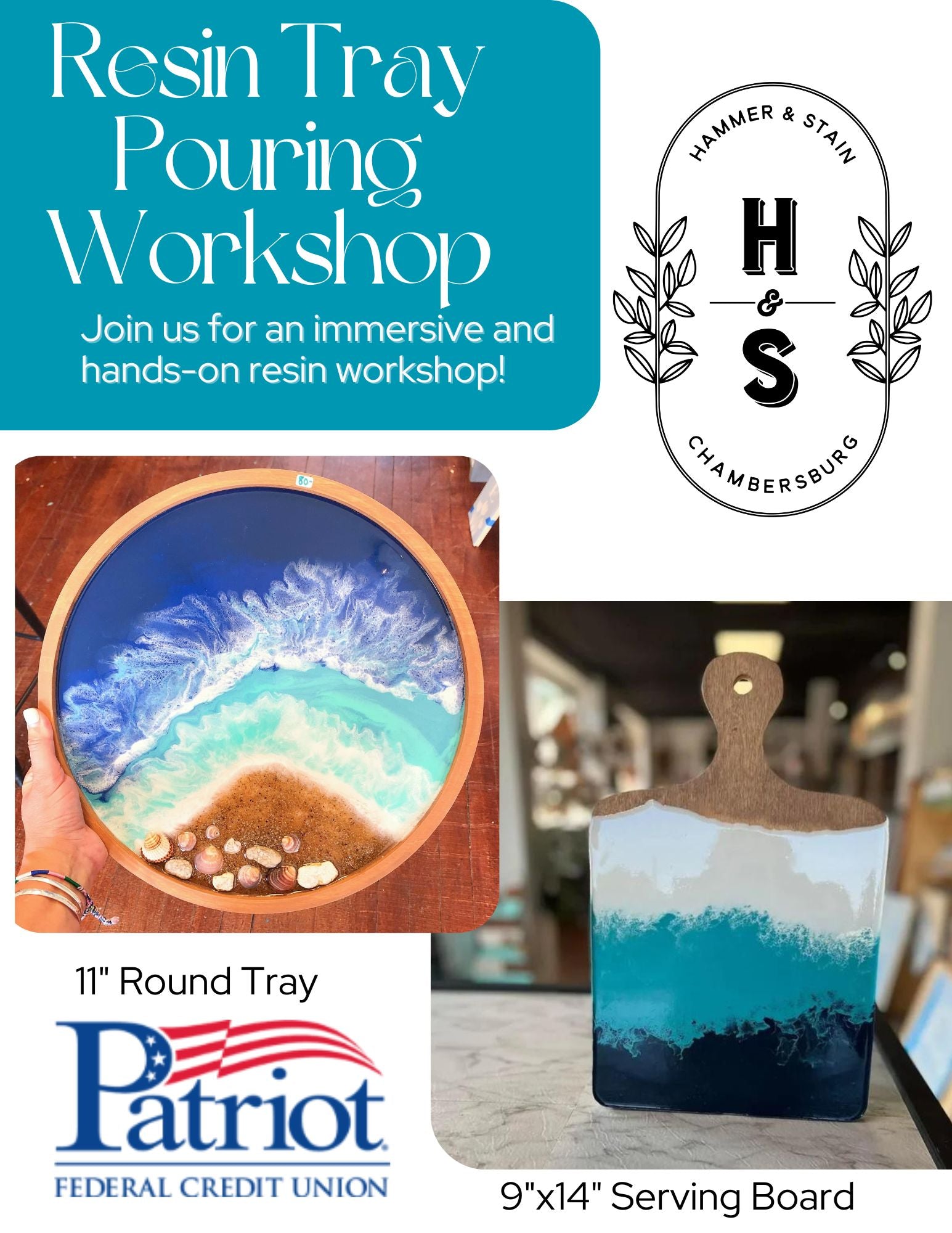 Join us at Hammer and Stain Chambersburg ( 31 S Main St Chambersburg) to create your very own Resin Pouring Trays Workshop. Where you can make your own DIY Resin Art Project (9x14" Rectangle Serving Board or 11" Round Tray ) We will teach you step-by-step how to create your own gorgeous project - these projects make for great handmade gifts for someone special or keep for yourself!