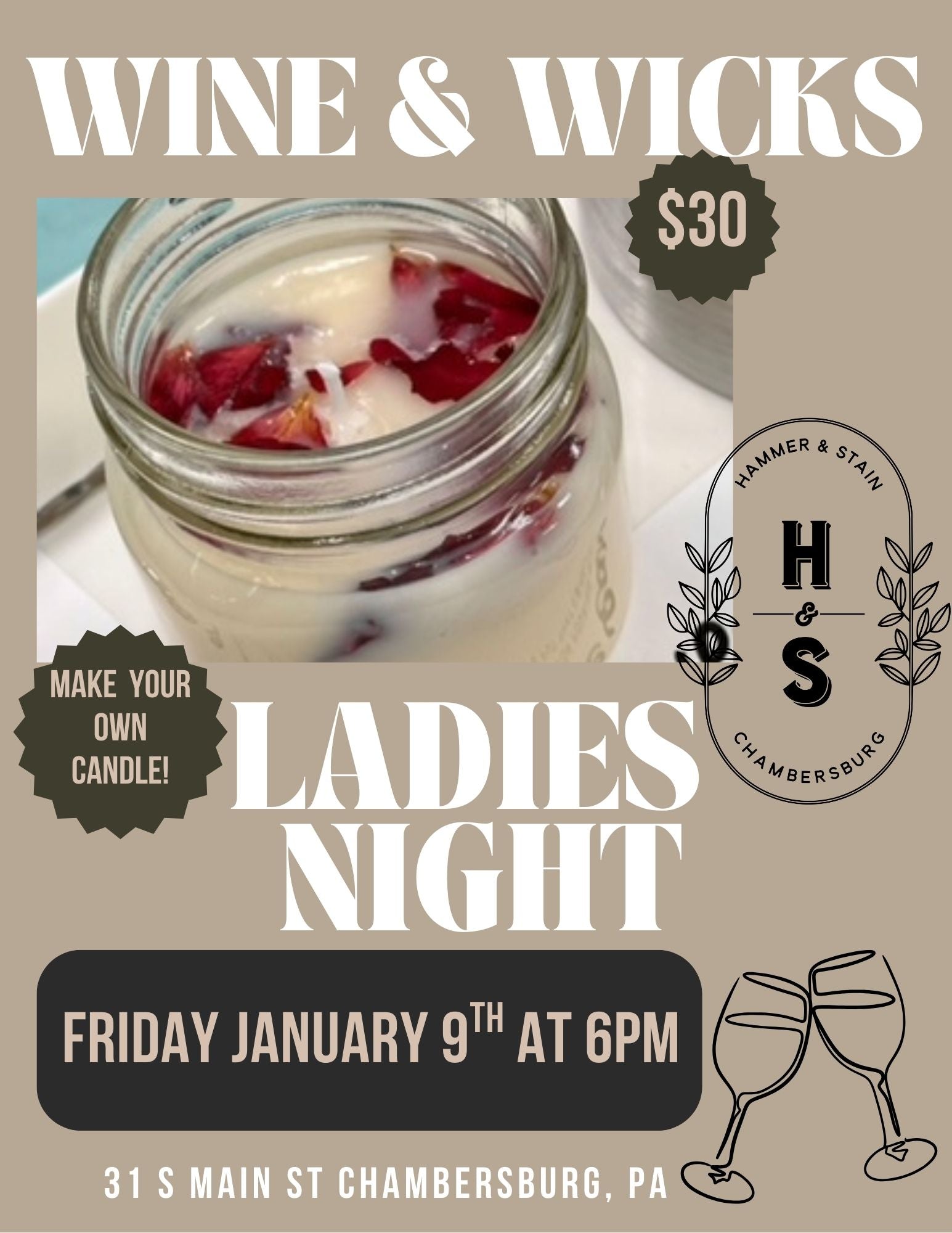 Join us for a fun and relaxing Ladies Night as we team up with Hammer & Stain Chambersburg for a Wine & Wicks Candle Pouring Experience! Create your very own custom candle while enjoying great company and a creative atmosphere.