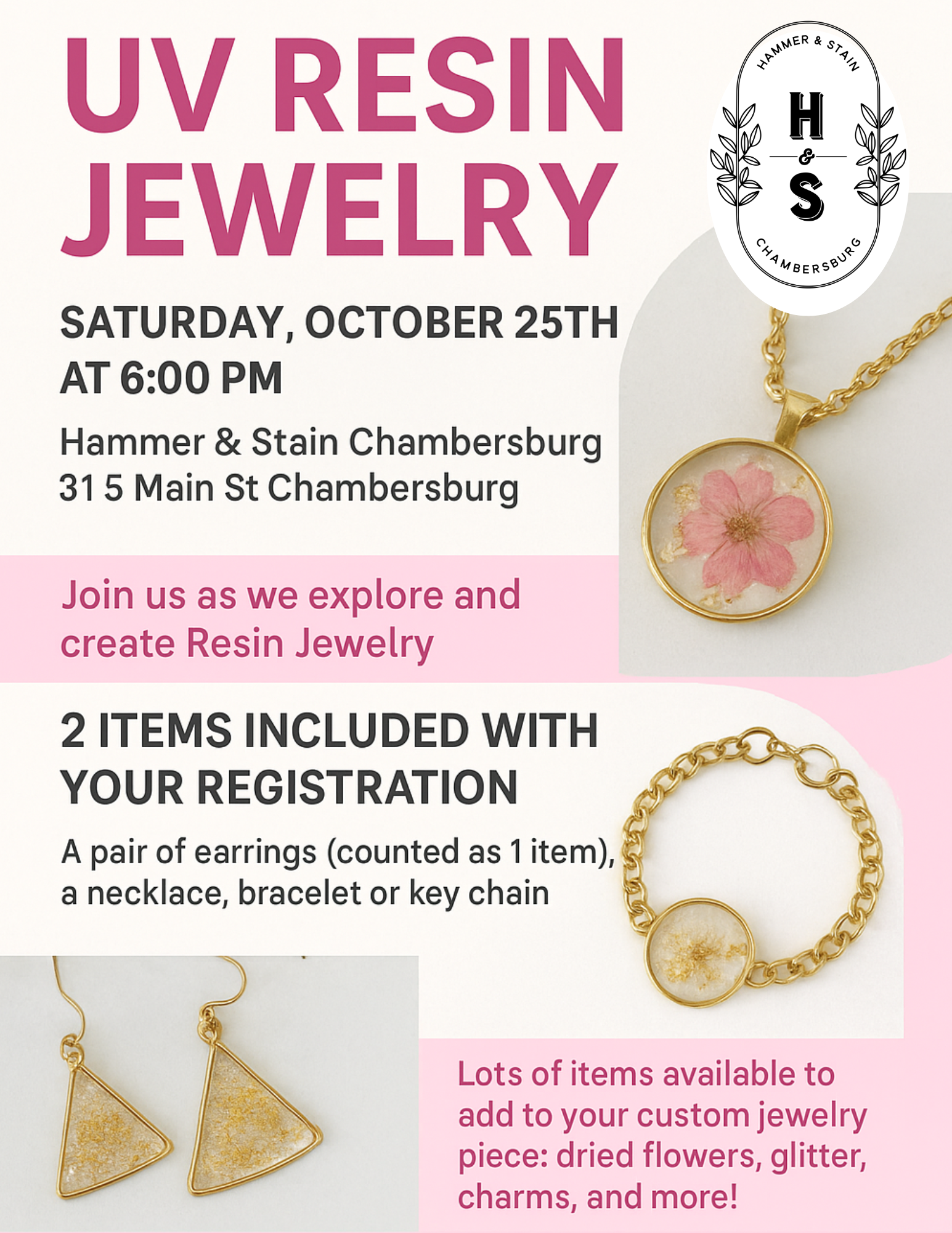 Join us on Saturday, October 25th at 6:00 PM at Hammer & Stain Chambersburg (31 S Main St, Chambersburg) for an exciting new workshop where you’ll learn the art of creating custom UV resin jewelry!
