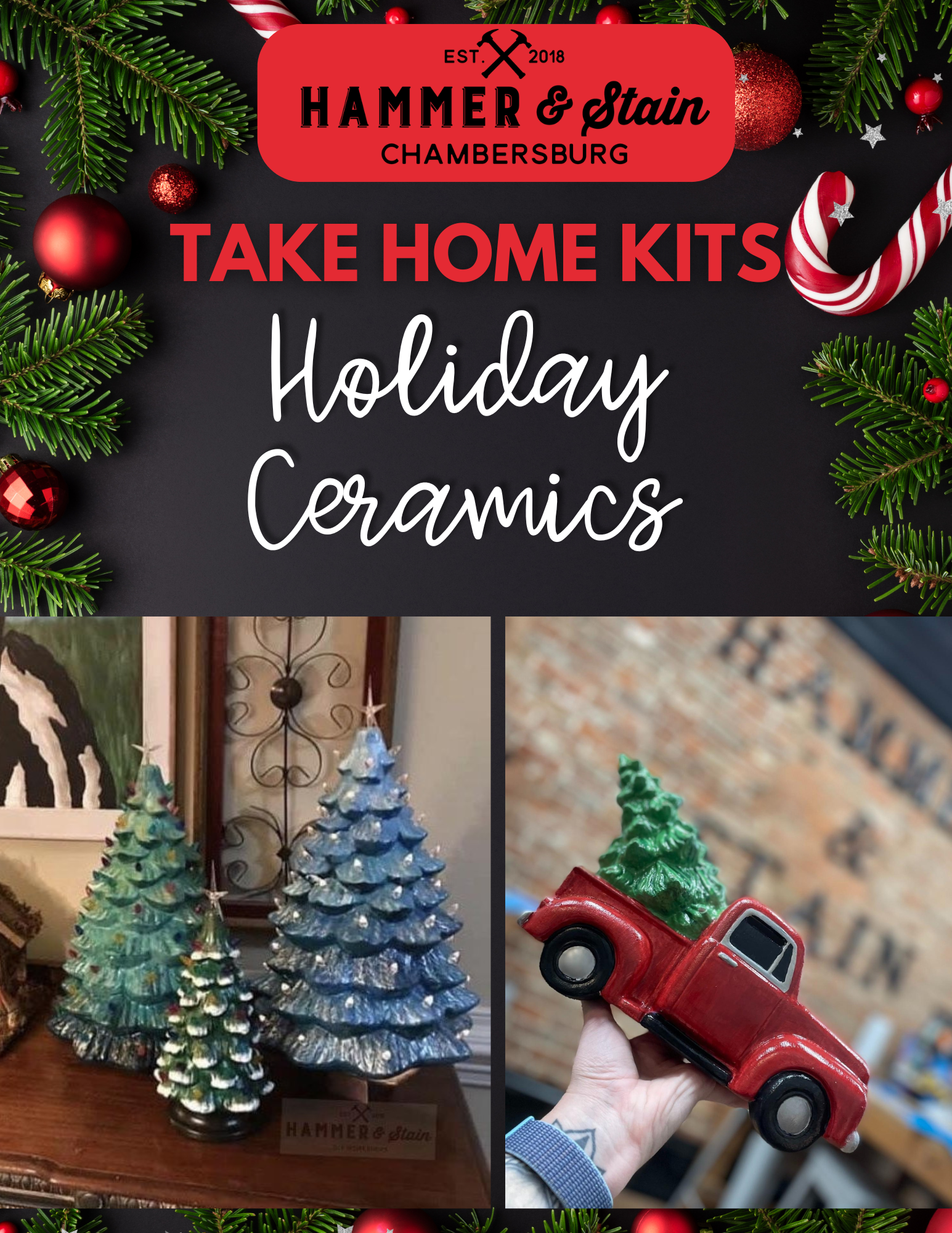 Bring the holiday magic home with one of our Take-Home Kits! Each kit includes all the supplies and step-by-step instructions you’ll need to paint and assemble your very own light-up ceramic masterpiece.